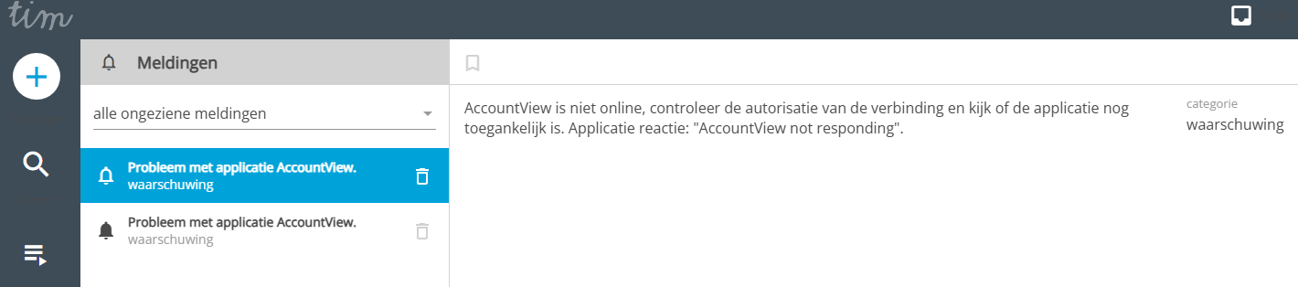 Deze foutmelding verschijnt dan als melding in Tim.
